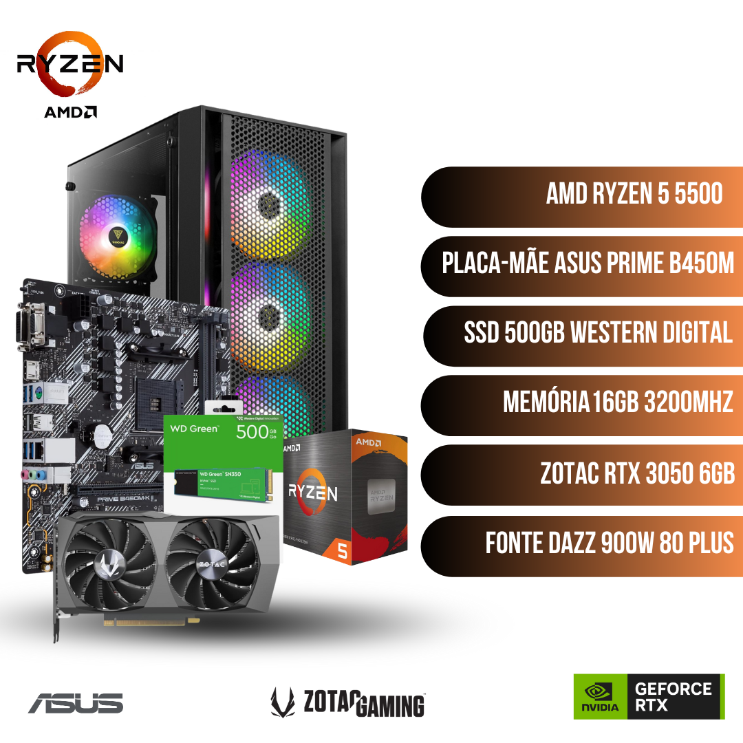 Computador Gamer AMD RYZEN 5 5500 + RTX 3050 6GB